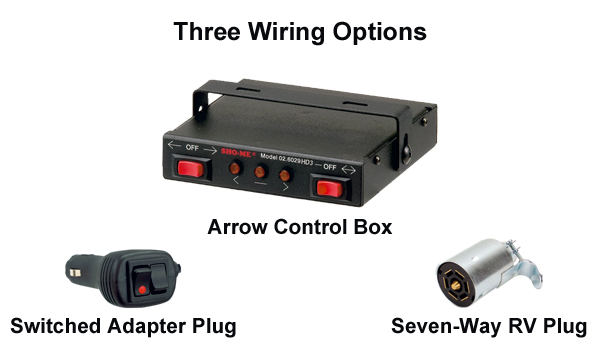 Available in three wiring configurations: arrow control box with 15-foot cable; switched plug-in adapter with 15-foot cable; or RV plug with blade connectors, housing-mounted momentary switch and 5-foot cable.